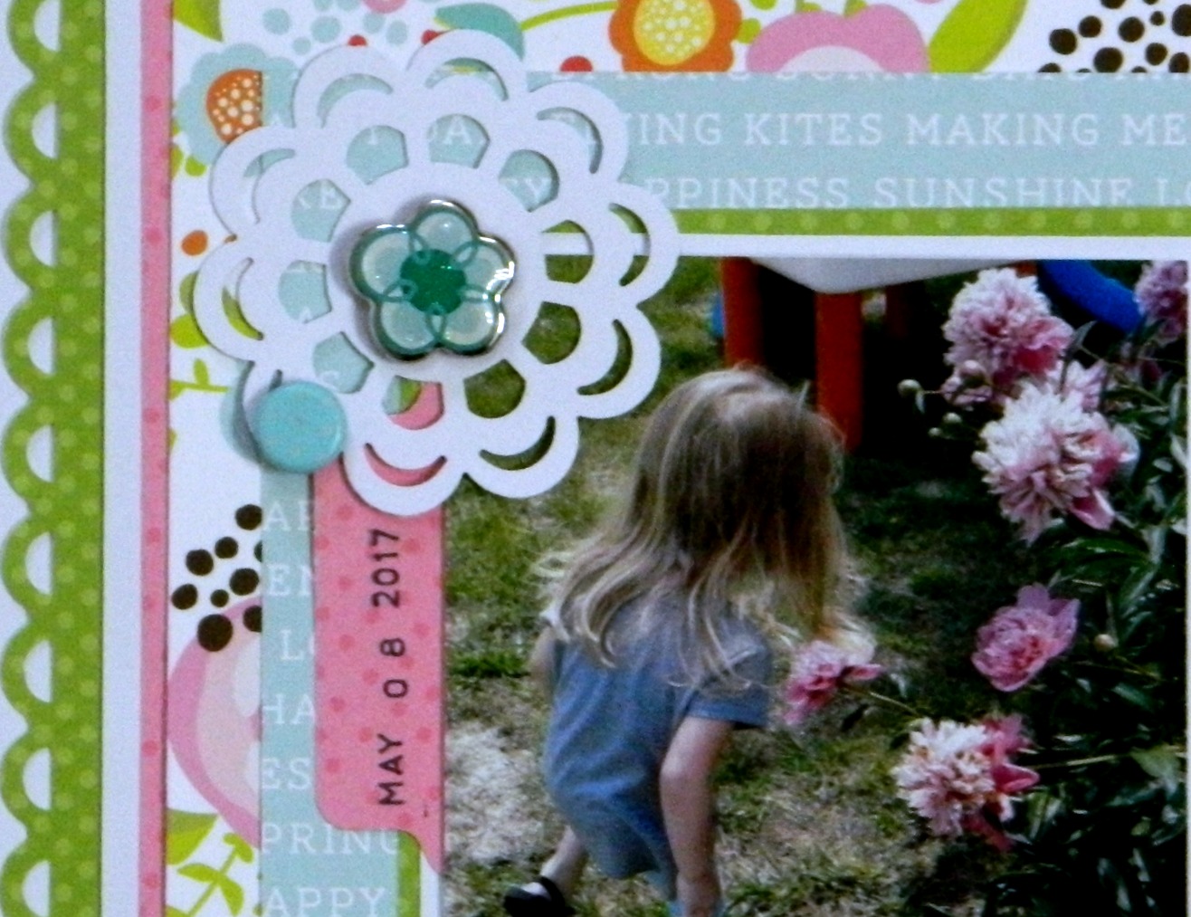 I started with half a piece of floral patterned paper on my background and I added a punched border strip to it. Everything on this layout was in this month's Great Stash Bash kit that you can read all about here. I was able to use up a few more of my scraps in this kit and I remembered to use a couple of the punches that I had put in my kit. I also added in a couple of stickers and a few more brads on this layout.